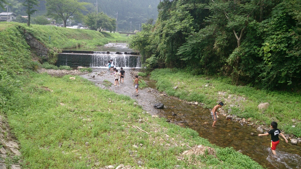 お昼ご飯を食べて少し休憩をしてから合宿所の横に流れる川で遊びます。